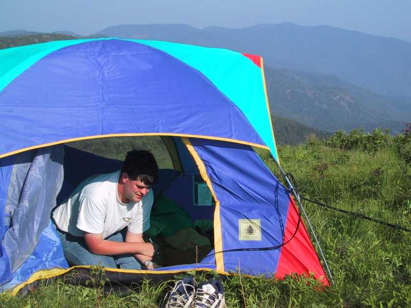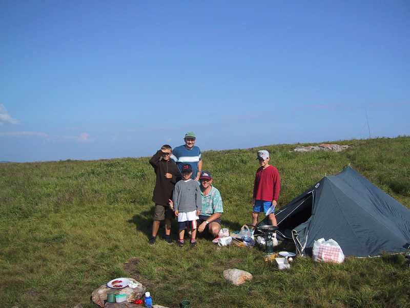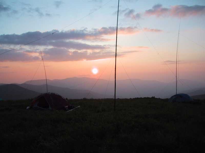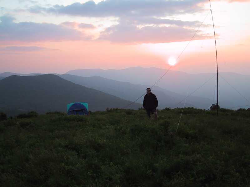 dropped Chris at his mom's QTH in Asheville.. Having woken up early and packed our back packs we took a very steep, windy and spectacular route from Chris' house to intersect the Blue Ridge Parkway. An enjoyable breakfast at the beautiful Pisgah Inn set us up for the day. We arrived at the parking area below Black Balsam Knob at around 11:30. This mountain is one of a number of 6000 foot peaks in the Shining Rock Wilderness area at mile marker 420. What a spectacular place. Absolutely beautiful countryside. We could spot AA4XX's DK9SQ pole atop the mountain above us. We trekked to the top with our heavy packs laden with Batteries, water and camping gear. Phew it was good to get there! Paul AA4XX was in good shape having enjoyed a peaceful night. The Wx was clear with a slight breeze blowing. Shortly my friend Paul and the kids joined us, also having lugged some heavy loads up the 20 minute climb. We set-up our tents and stations, erecting 2 *20meter inverted Vee's for Phone and CW plus an 80 meter Inverted Vee pointing North. We were ready just in time for the start of the contest at 18:00Z. We operated the club call WQ4RP. Paul started racking up the cw contacts on 20m and Chris talked up the 1.5 watt White Mountain phone rig on 20m phone. This was a tough proposition with all that QRM! I worked 40m CW which was frustrating since I could hear but not work most stations. I switched to 15meters which was much better.