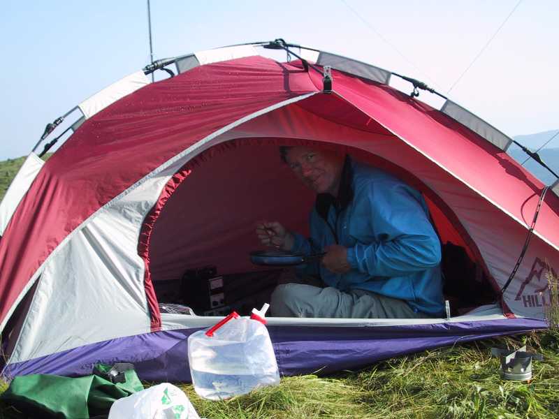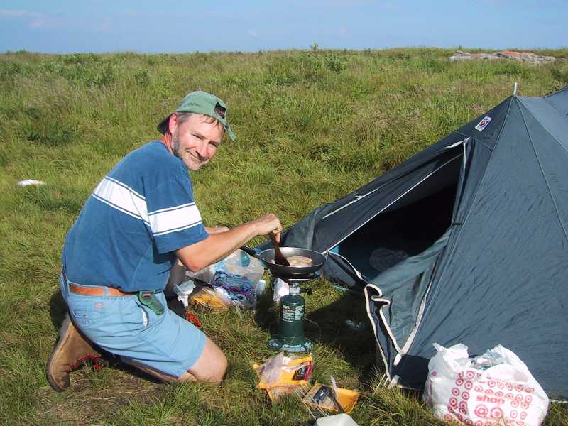 AA4XX in his tent At nightfall we cooked our dinners.My non-ham friend Paul cooked some
